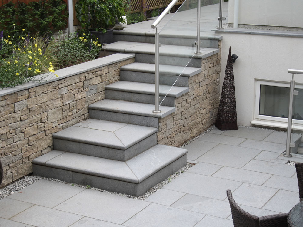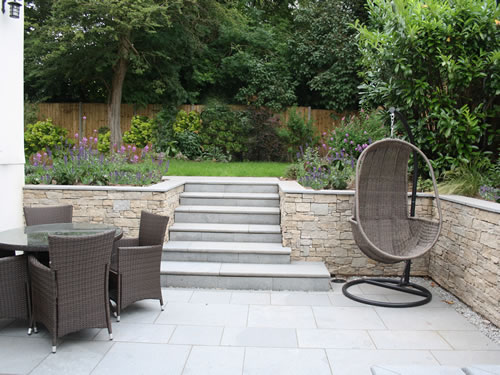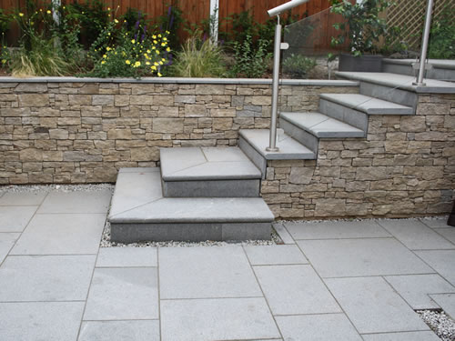 Retaining walls were built around a terrace paved with blue-grey granite. The walls were faced with natural stone. The steps made a feature at each end with bull-nosed treads and mitred corners. Glass and metal handrails completed the contemporary look. The fence will be covered with a clipped yew hedge to act as a foil for the planting in front of it.